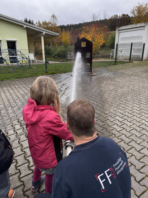 Auch der Spaß kam nicht zu kurz, an einem Übungshaus konnten die Kinder, mit Hilfe eines Feuerwehrmannes, ihre Fähigkeiten an einem Strahlrohr versuchen und imaginäre Flammen löschen.