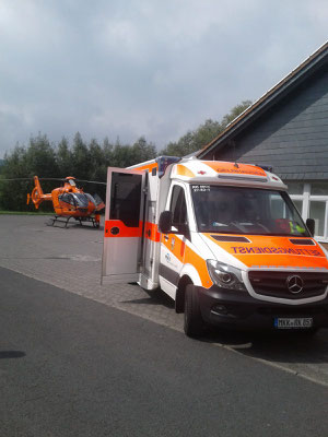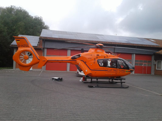 Rettungshubschrauber landete auf dem Hof des Feuerwehrhauses und die Besatzung wurde durch die Feuerwehr zum Unfallort gefahren.